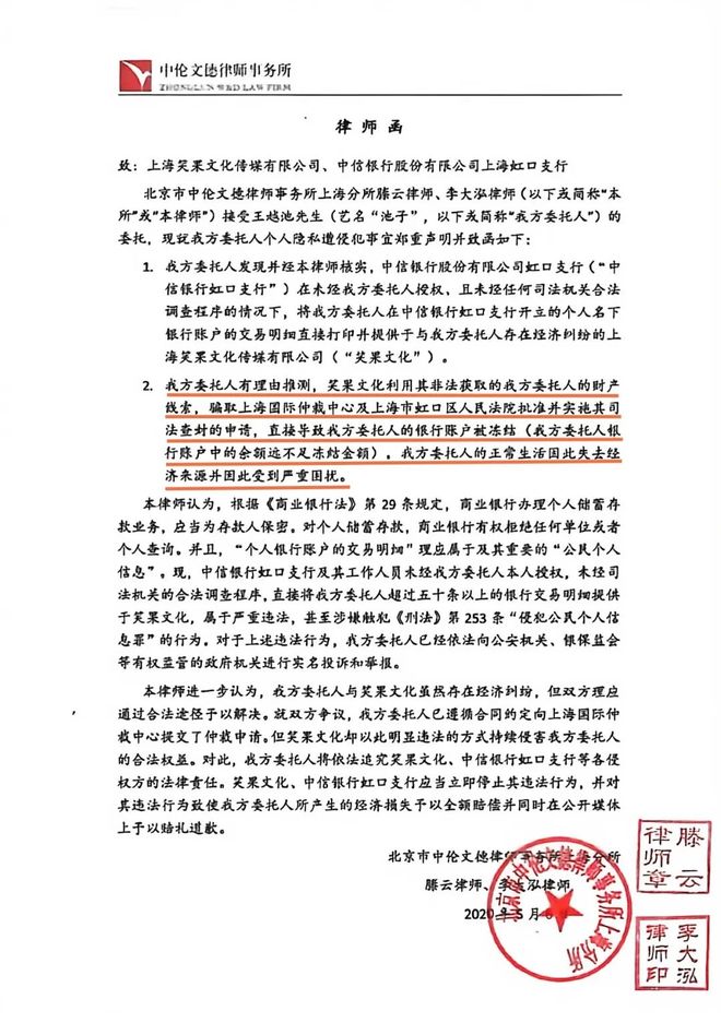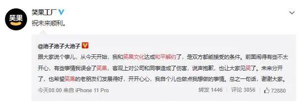 池子畢竟是活躍在屏幕上的名人,有話題,有商業價值,2020年和笑果解約大戰後熱度得到維持,年底經過黃覺搭橋簽約黃本人所在的經紀公司萌揚文化。