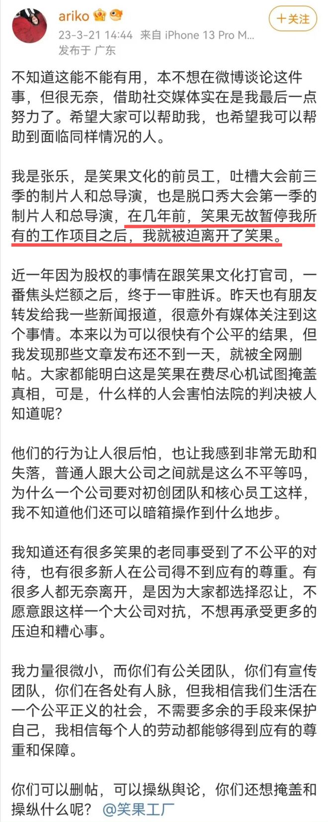 是的,資本有時候就是這麼殘酷,要知道,張樂在笑果勞苦功高,她從2012年起在葉烽導演組工作直到2019年,柒年時間,離開時連作為笑果初創員工的原始股份變現也沒有拿到。