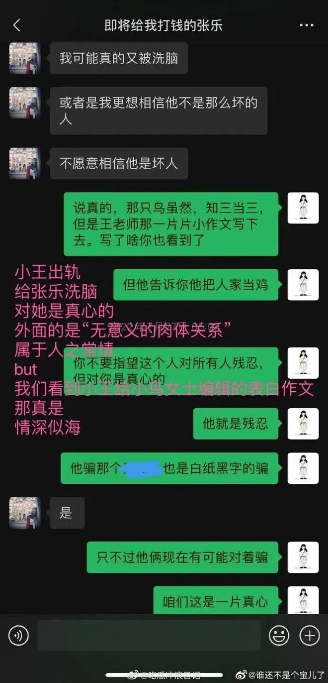 張樂的前好友桑寶兒的微信截圖,對話框左邊是張樂,右邊是桑寶兒,對話中,那只鳥指的是豆得兒,王老師指池子。從對話中可以看到,張樂和桑寶兒稱豆得兒“知叁當叁”,池子也非好人,兩頭行騙。