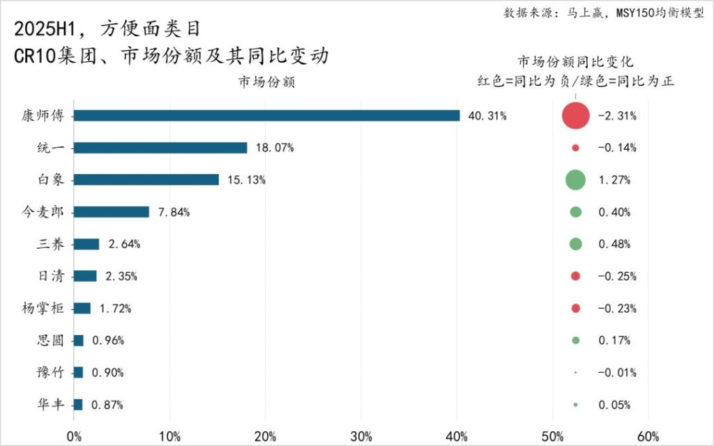 在2025年上半年,據馬上贏數據,方便面行業市場份額前10的品牌中,康師傅、統壹合計所占市場份額已經接近60%,位於第叁名的白象占有市場份額15.13%;而今麥郎的份額卻只有7.84%,它的後面還有憑借著火雞面大單品吸引年輕群體的叁養正在奮力追趕。
