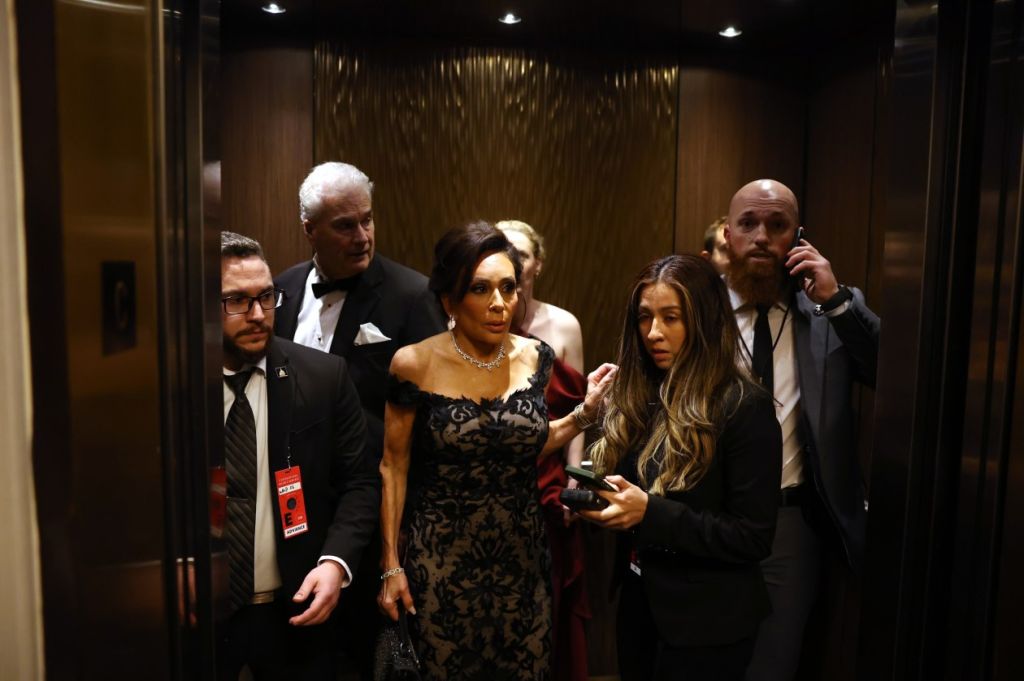 特工们散布在整个宴会厅,站在桌子上,手持武器。内阁部长们被紧急带出房间,一名安保人员呼喊众议院议长迈克·约翰逊(Mike Johnson)的妻子凯莉(Kelly)。找到她后,这名安保人员将她从桌子下拉出来,并带离了房间。