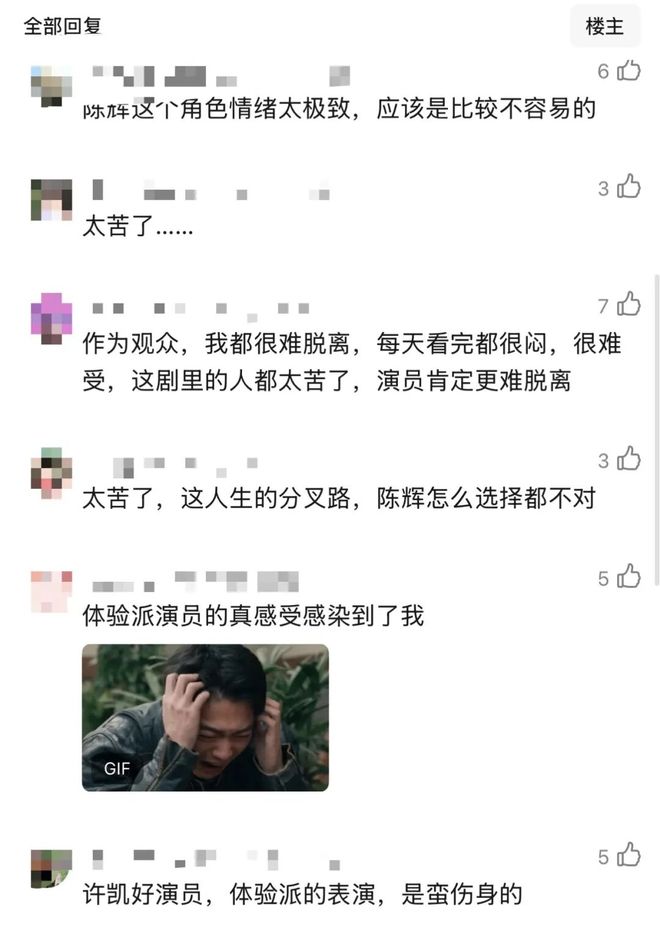 许凯本人在追剧团活动上坦言,接陈辉这个角色压力巨大,“陈辉不是传统好人,也不是纯粹坏人,是个充满挣扎的灰色人物,完全跳出我以往舒适区”。