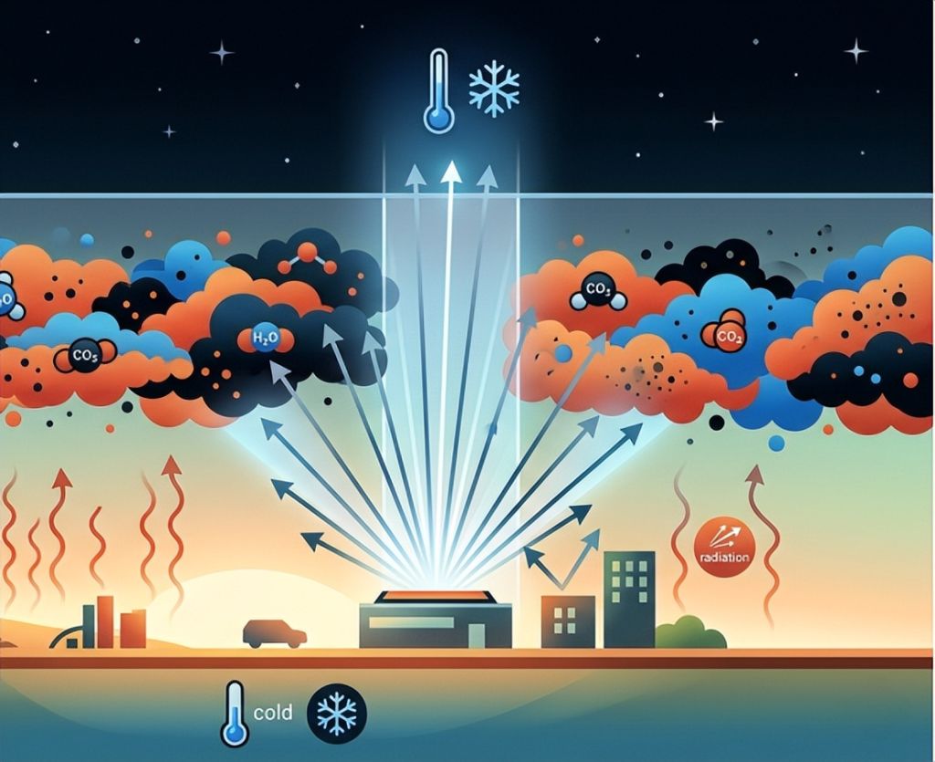 為了克服這壹局限,輻射制冷技術成為近年來備受學術界和產業界關注的方向。其原理在於,地球大氣在波長約 8 至 13 微米的中紅外范圍內存在壹個“大氣透射窗口”,處於這壹波長范圍內的熱輻射可以直接穿透大氣層,逃逸至外太空。地球表面溫度約為室溫的物體,恰好在這壹波段具有較強的熱輻射,從而可將熱量“傾倒”至宇宙空間,,從而實現無需電力的被動降溫。