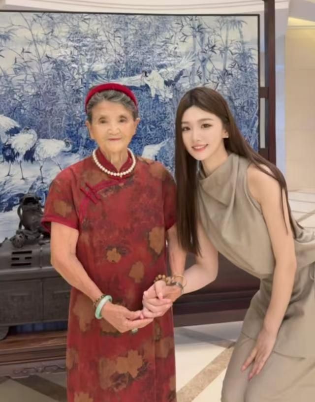 老太太笑著給李雋子遞茶,親熱地拉著她的手合影。