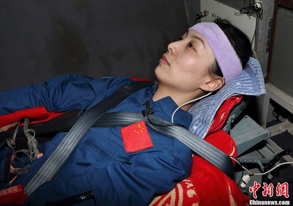 6月10日下午3时,天宫一号与神舟十号载人飞行任务总指挥部在酒泉卫星发射中心举行新闻发布会,宣布神舟十号航天员飞行乘组成员。图为王亚平在做离心机测试训练准备工作。新社发 秦宪安 摄