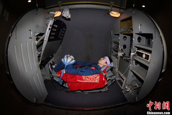 6月10日下午3时,天宫一号与神舟十号载人飞行任务总指挥部在酒泉卫星发射中心举行新闻发布会,宣布神舟十号航天员飞行乘组成员。图为张晓光进入模拟返回舱训练。中新社发 秦宪安 摄