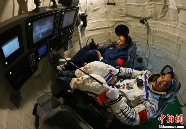 6月10日下午3时,天宫一号与神舟十号载人飞行任务总指挥部在酒泉卫星发射中心举行新闻发布会,宣布神舟十号航天员飞行乘组成员。图为聂海胜、张晓光进行手控交会对接训练。 中新社发 秦宪安 摄