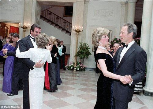 1985年9月,當時24歲戴安娜王妃訪問美國。在白宮大廳內,戴安娜王妃與當時的湯姆帠立克(Tom Selleck)、克林特伊斯特伍德(Clint Eastwood)等名人跳舞,照片中戴安娜王妃的表情略顯緊張。