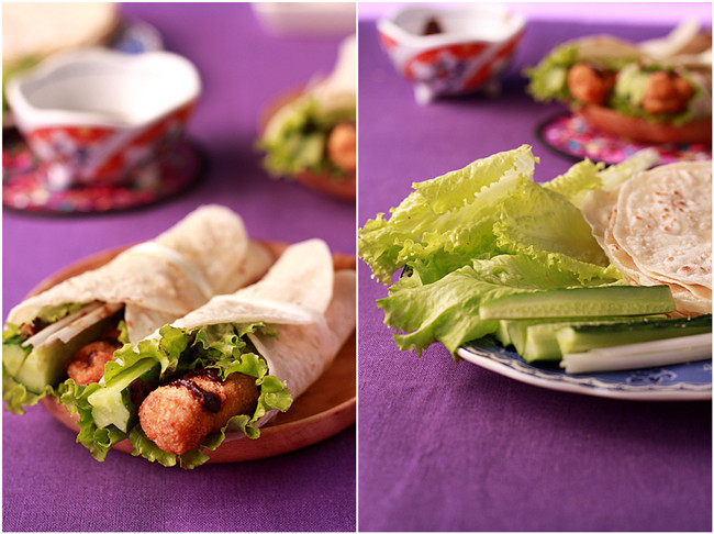 17.雞脯肉用刀背敲松,切成大拇指粗細的條。18.雞脯肉裡加入黑胡椒粉,料酒,鹽,生抽,澱粉,蛋清1個。19.用手抓拌均勻,醃制3小時以上讓雞肉入味。20.醃好的雞肉在澱粉裡裹壹均勻。21.雞蛋打散,把裹好澱粉的雞肉過壹遍蛋液。22.然後在面包糠裡裹壹圈。23.鍋裡倒油燒至7成熱,下入雞肉開始炸。24.炸至金黃色撈出控油。25.烙好的薄餅鋪在案板上,放壹層生菜,放上炸好的雞肉,蔥絲,黃瓜條,擠上甜面醬。26.卷起來就可以吃嘍。