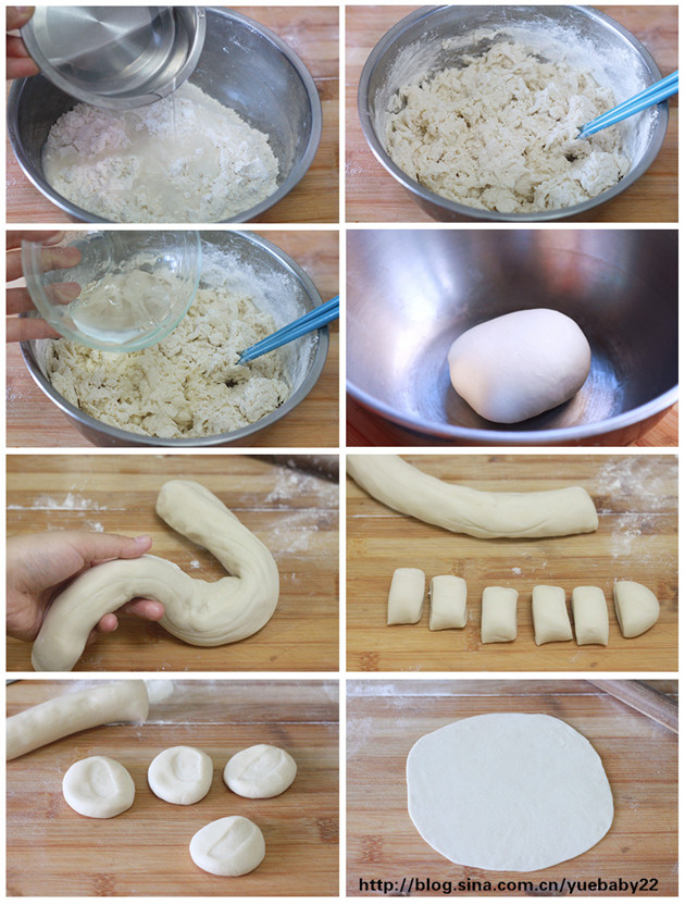做法:1.面粉中加入鹽,倒入140克滾開水。2.邊倒開水邊用筷子攪拌,成雪花絮狀。3.加入涼水,和成“叁光”面團。4.揉好的面團蓋上濕布,放在壹邊醒發3小時以上。5.醒好的面團揉勻,搓成長條。6.案板撒面粉,把長條切成小的劑子。7.把小劑子按扁後。8.用擀面杖把小劑子擀成直徑20cm左右薄餅。
