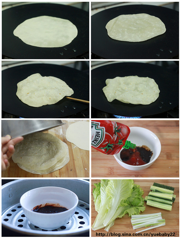 材料:炸雞材料:雞脯肉1塊,雞蛋1個,蛋清1個,黑胡椒粉10ml,生抽10ml,料酒5ml,鹽4克,雞蛋1個,澱粉適量,面包糠適量。卷餅材料:面粉300克,熱水140克,涼水40克,鹽2克。其他材料:甜面醬45ml,番茄醬15ml,生菜適量,黃瓜適量,蔥白適量。