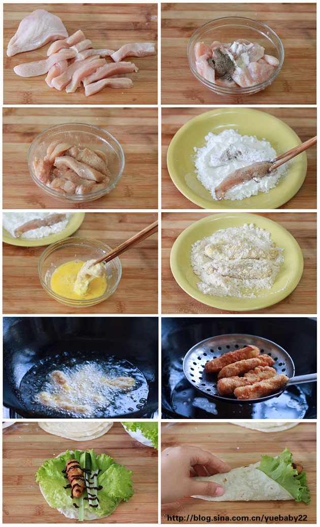 17.雞脯肉用刀背敲松,切成大拇指粗細的條。18.雞脯肉裡加入黑胡椒粉,料酒,鹽,生抽,澱粉,蛋清1個。19.用手抓拌均勻,醃制3小時以上讓雞肉入味。20.醃好的雞肉在澱粉裡裹壹均勻。21.雞蛋打散,把裹好澱粉的雞肉過壹遍蛋液。22.然後在面包糠裡裹壹圈。23.鍋裡倒油燒至7成熱,下入雞肉開始炸。24.炸至金黃色撈出控油。25.烙好的薄餅鋪在案板上,放壹層生菜,放上炸好的雞肉,蔥絲,黃瓜條,擠上甜面醬。26.卷起來就可以吃嘍。