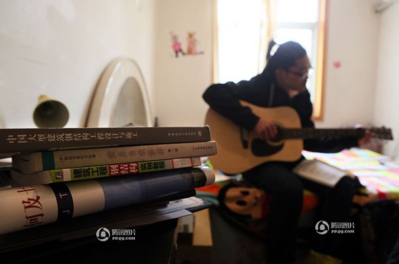 王俊在租住的房子里练习吉他,他嗓子很好,能模仿很多歌星的嗓音唱歌。