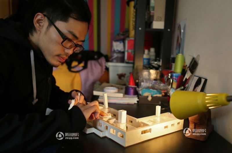 这是王俊大学时做的教学楼模型,休息时他会擦一擦模型上的灰尘。