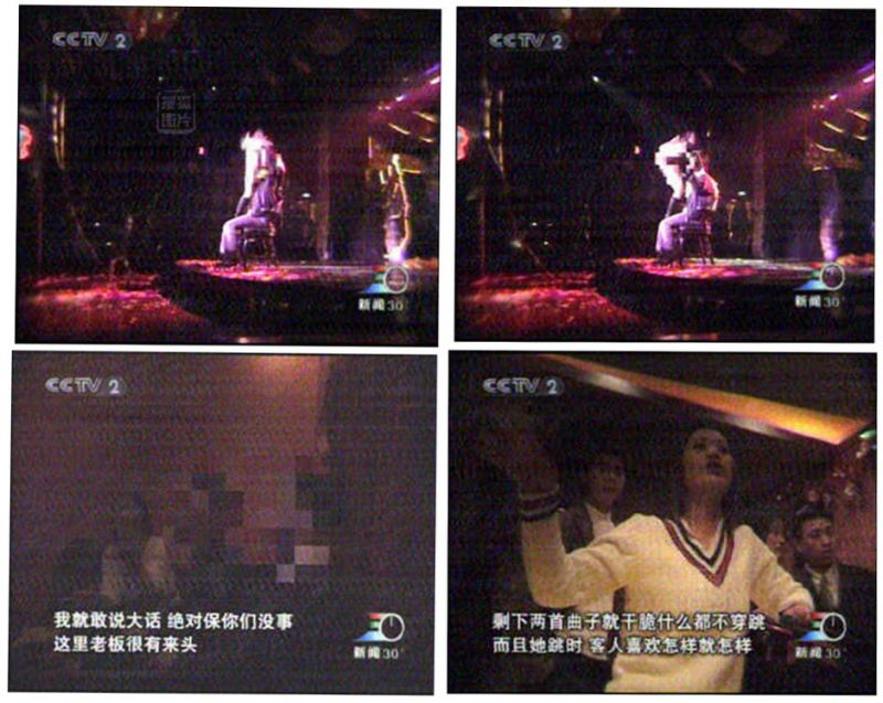 “金色時光”夜總會中,作色情表演的女郎爬到男觀眾身上。(左上)場面極其下流,台上台下形成了“互動”。(右上)逸東酒店夜總會女領班向客人保證“沒事”。 (左下)逸東酒店夜總會女領班推銷其色情節目。(右下)早在2003年1月21日,中央電視台即在當天午間的“新聞30分”節目中披露,廣東東莞樟木頭鎮壹些酒店夜總會等場所公開進行色情表演,場面不堪入目,當地警方接到舉報後,卻聲稱“沒理由”去檢查。而同年,東莞警方已在當地展開違法犯罪的嚴打行動。有關報告分析指出,在東莞的投資中,大量投資是港台等外地資本,本地民營企業家的投資僅占30%。而這些民營投資中60%~70%,集中在酒店業和桑拿中心等地下色情相關產業。