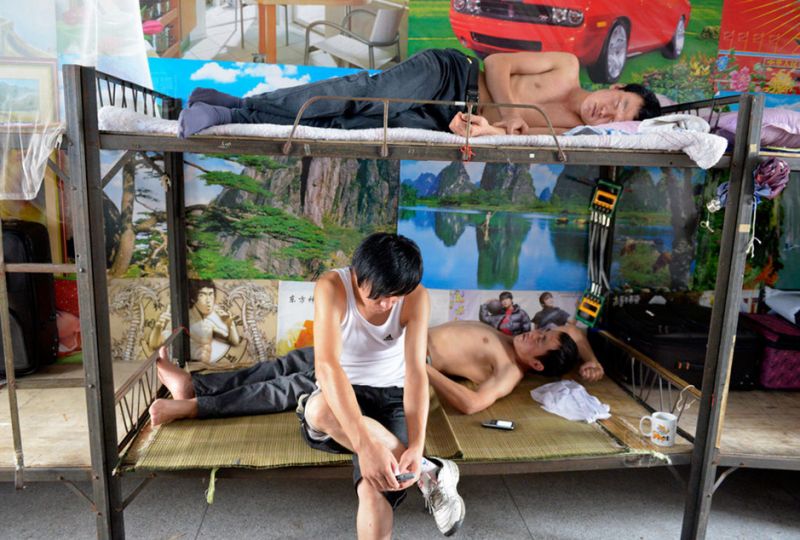 圖為2012年6月18日,廣東省東莞市。打工者在集體宿舍睡午覺。