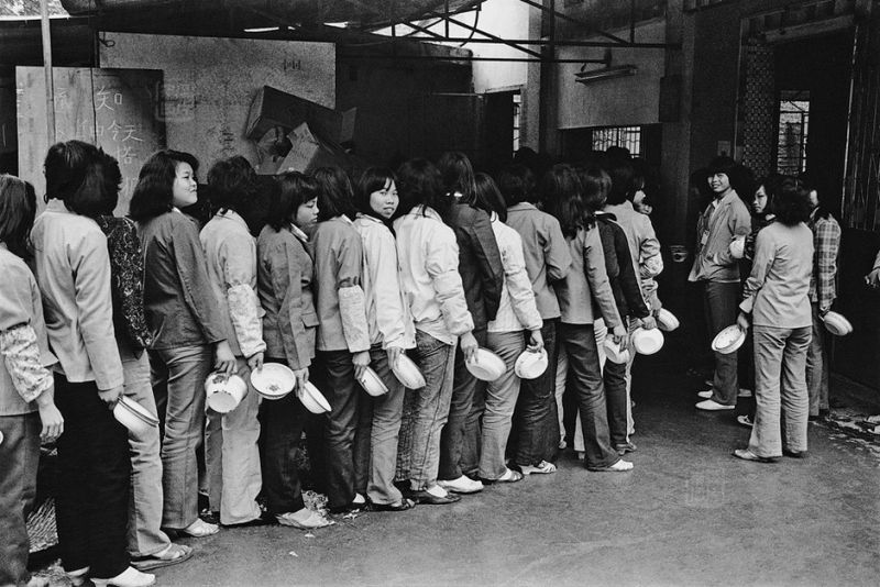 東莞的地下色情行業起步被認為是在1995年前後,這個行業最初的發展緣於壹些常年離開老婆孩子來東莞投資的台商、港商,以及招待壹些談生意的客人,還有就是全國各地來此打工的工人的需求。然而早在上世紀80年代,東莞的地下色情業已然興旺,不過當時東莞地下色情業的主要標志不像今天有高檔酒店配套、有網絡宣傳的桑拿中心,而是粉紅燈下的“溫州城”、“福建城”。這類場所,如今在國內肆伍線城市依然活躍。那個時節,大批港商來東莞投資辦廠。東莞地處廣深之間,有大片農田,地租便宜,交通便利,天時和地利。港商帶來資金和設備,但對大陸的政治環境心存憂慮,生怕隨時被“共產”,所以大多不敢攜妻帶子。這些正值壯年的男人有錢有需求,這也成了擺在東莞執政者面前的現實問題。圖為1988年,廣東東莞,壹家來料加工工廠的食堂外。
