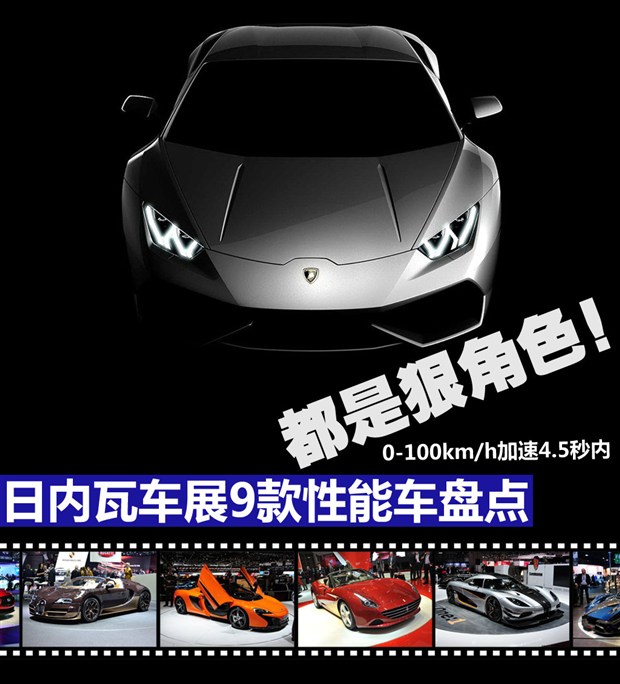2014日內瓦車展仍在進行之中,在媒體日70余款新車首發後,相信其中不少車型已 經成為您目前關注的重點。為了讓大家看的更過癮,今天我們特意為愛車的您准備了車展性能車盤點這道大餐。今天入選的車型我們遵循兩個標准,其壹是車展首發 的新車,另壹個則是0-100km/h的加速時間在4.5秒內。經過我們梳理,本屆車展首發的有科尼賽克0ne:1、蘭博基尼Huracan、法拉利 CaliforniaT、邁凱倫650S以及Gumpert Explosion等9款車型,每款車可以說都是“狠角色”,相信壹定能夠讓您看的過癮。