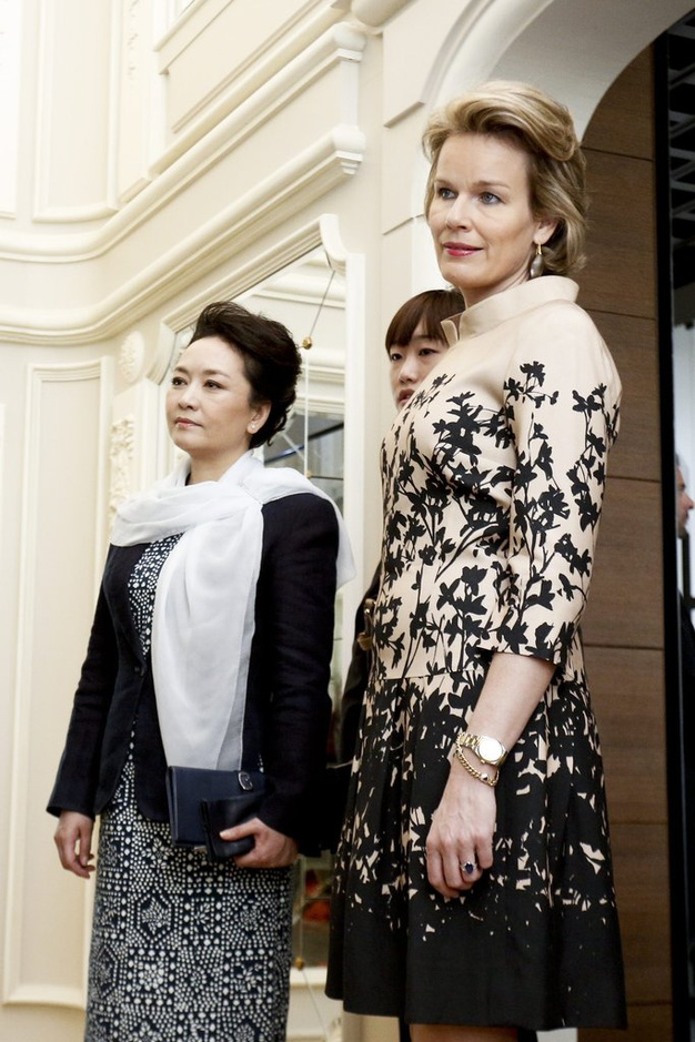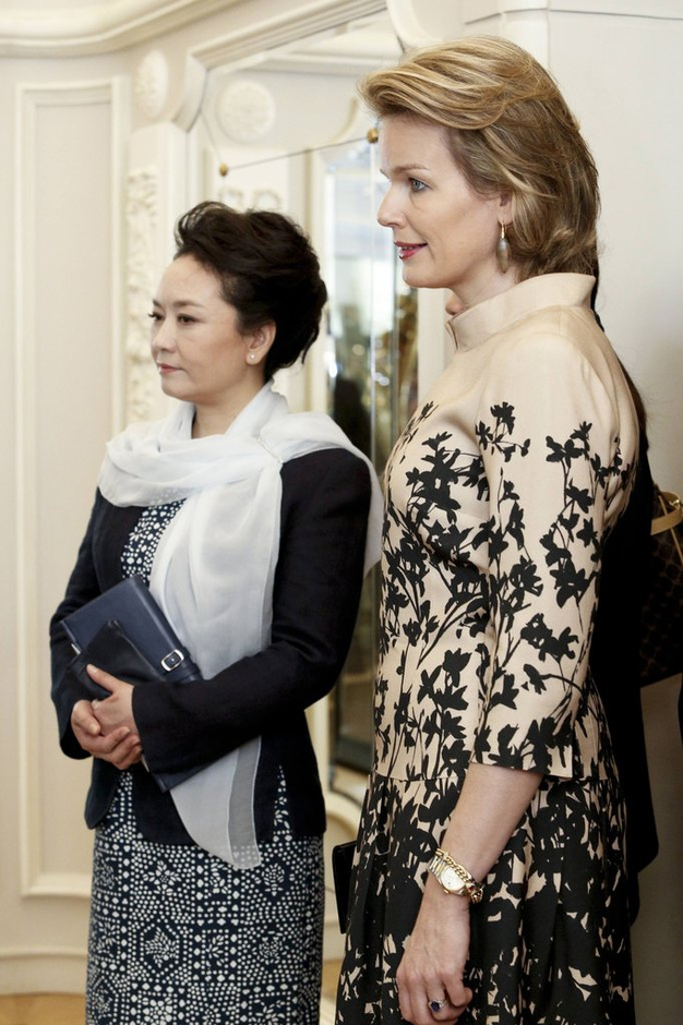当地时间2014年3月31日,比利时布鲁塞尔,习近平主席夫人彭丽媛在比利时王后玛蒂尔德陪同下,来到布鲁塞尔乐器博物馆参观。彭丽媛参观了中国乐器展和萨克斯管展示馆,并同两国艺术家交流。彭丽媛表示,这是一次文化之旅,希望两国艺术家加强交流。