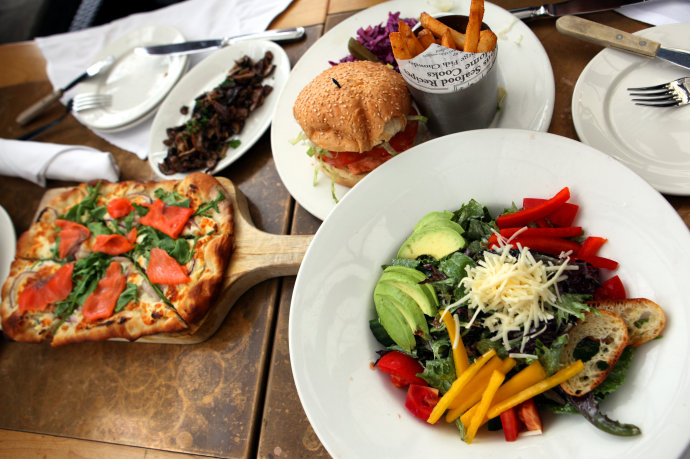 我们是冲着烤牛排和烤三文鱼去的,却被告知逢周六、周日,只有晚餐才提供。点了一个三文鱼比萨、一份三文鱼汉堡、一盘炒香姑和一盘色拉,80加元(含税),另付10加元小费,共计90加元。