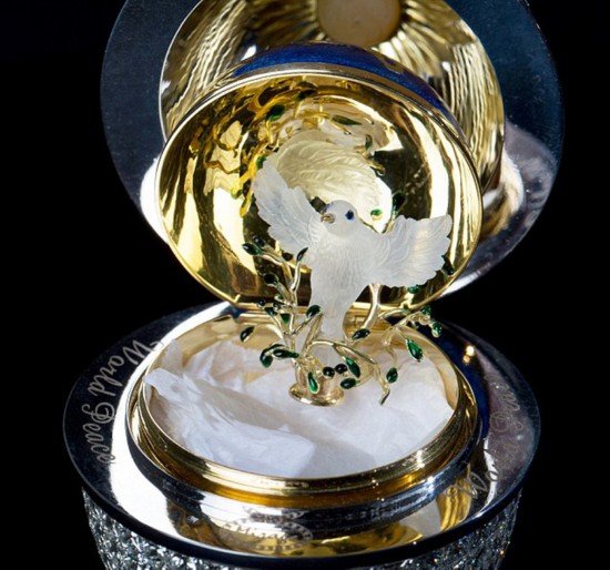 打开“幻影蛋”蛋壳后,可以看到里面装饰华丽的迷你地球仪。将地球仪顶端提起,里面是用无色水晶雕成的白鸽。