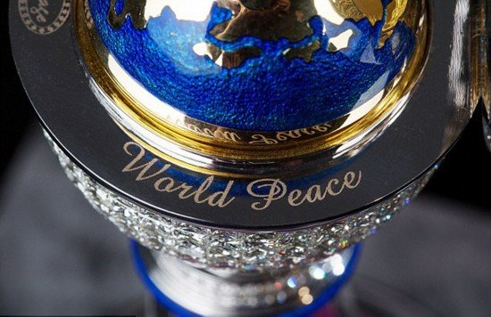 白鸽栖息在黄金橄榄枝上,还有黄金手工雕刻的“世界和平”字样。