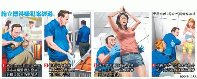 英美多间传媒图文并茂报道施立德醉酒闹机场的事件,并附上施立德的facebook相片。报道指,施上周在三藩市机场A区通过安检,到机场禁区的酒吧喝酒数小时后折返安检区。施身穿卡其裤和蓝色polo恤,与安检员制服相似。闭路电视拍得他在该处流连约40分钟,并戴上安检员专用的蓝手套。他涉嫌向一名亚裔女游客自称美国运输安全局(TSA)职员,并带她到私人搜身区搜身。他企图为另一女游客搜身前,遭其他安检员发现并报警。当局规定,男安检员为女士搜身时,必须有女安检员陪同。