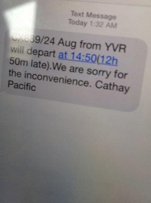 国泰航空凌晨1时32分才以短信告知旅客,航班要延误近13个小时,且之后没有其他讯息。(记者朱冠华/摄影)