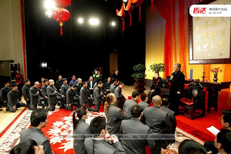 2008年2月11日,趙本山舉行收徒儀式,共收徒35名。趙本山向徒弟以及公眾解釋收徒目的時說:“我收你們的目的,不是為了有幾個徒弟整天圍著我轉,而是為了贰人轉這個藝術形式更好地發展。”圖為收徒儀式現場,徒弟們向趙本山行禮。他們中,包括了日後成名的“小沈陽”、王小利等人。