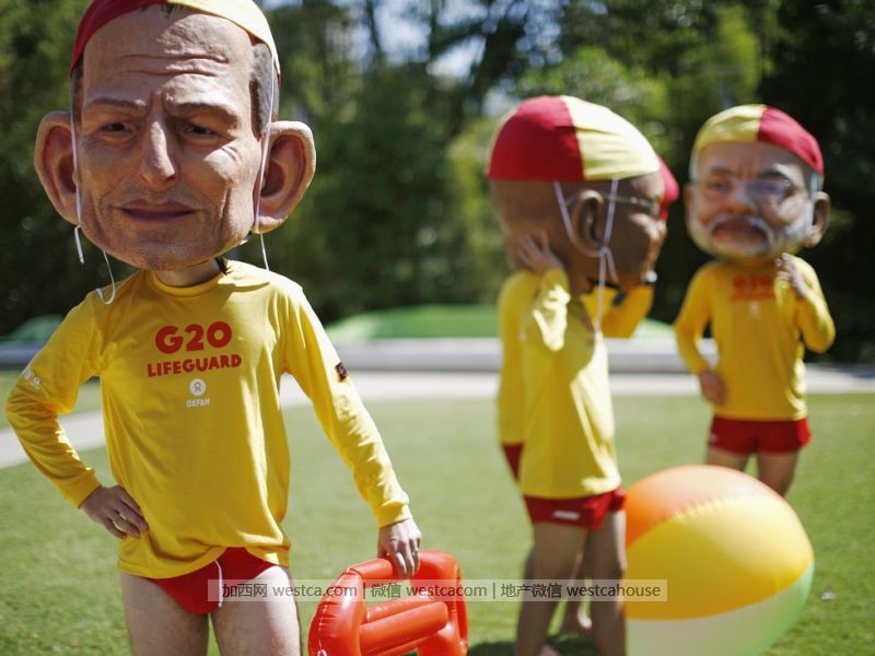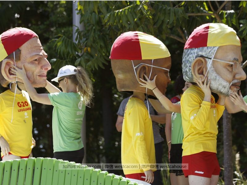 G20峰会召开在即,将与会的中国国家主席习近平、美国总统奥巴马等领导人成大头娃娃。澳大利亚布里斯本示威者头戴面具,呼吁全球平等。从左至右分别为,南非总统祖玛(Jacob Zuma)、中国国家主席习近平和印度总理莫迪(Narendra Modi)。