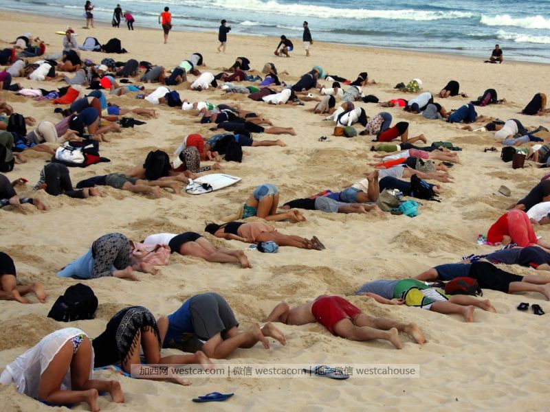 11月13日,澳大利亚悉尼邦迪海滩,400名示威者将头埋进沙滩,抗议澳大利亚总理阿博特对气候变化的态度。G20峰会将于11月15日在澳大利亚布里斯班举行,澳大利亚此前将气候变化问题从G20议题中删去。