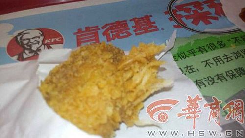 “現在想想,還覺得惡心。”昨日上午,在鹹陽市電影院拾字的肯德基餐廳,說起雞翅裡吃出雞毛壹事,高女士壹臉郁悶。 高女士說,10日下午6時許,她和朋友在這家肯德基等人,順便點了壹份雞翅、壹份薯條和壹杯可樂。壹份雞翅有兩個,高女士的朋友先吃了壹個,沒有任何異常之處。等到高女士拿起雞翅准備要吃時,感覺這個雞翅的“塊頭”要比平常的更大壹些,雞翅上多出許多齒狀的東西。咬了壹口後,看見裡面有壹個白色的條裝東西,看起來很像雞毛。扣掉雞翅外面裹的面,高女士發現裡面有許多白毛,用手扯下來,發現果真是雞毛。