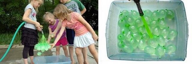 聰明的老爸發明了壹個壹次性將水充滿數拾個氣球的水槍,這樣孩子們打水仗可方便多了!