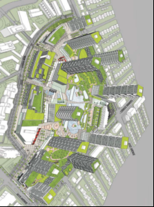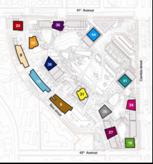 图6 渥列治商业中心布局图。数字代表每个大楼的楼层数。9 是指9层高楼。44指44层的高楼。