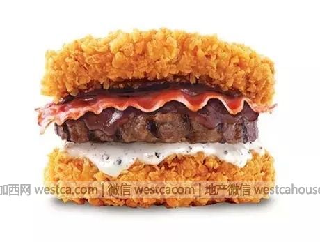 宇宙無敵Double Down,直譯過來是“加倍”,用炸雞代替面包,中間夾烤培根以及兩種芝士,熱量飛到月亮上。據說吃了會忘記壹切傷痛。