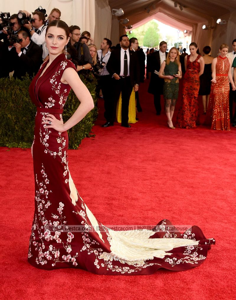 Dianna Agron用裙子下摆上的一排刺绣仙鹤演绎“中国”主题(西方人对这种象征长寿的动物情有独钟),裙子很素雅。