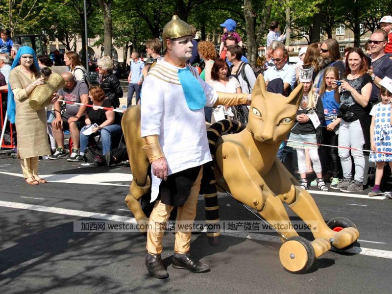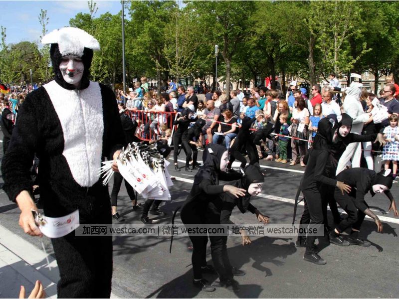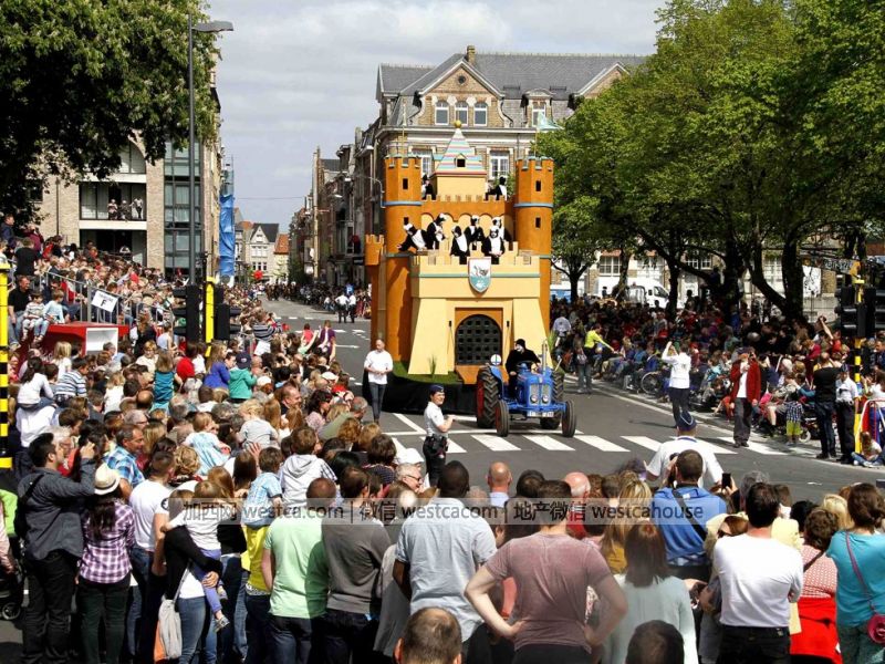 5月的第2个周日是全球庆祝母亲节的大日子,但对伊普尔(Ieper)的居民来说,每隔3年的母亲节,伊普尔就会被“喵星人”全面占领,因为这一天的伊泊尔橱窗摆设的是猫咪、摊贩卖的T恤是猫咪图样,连比利时最著名的特产巧克力都会做成猫咪形状,因为这一天是伊普尔3年一次的抛猫节。当然,最引人注目的还是“猫车”游行。“猫车”分方队出场,每个方队一个主题。巨型猫车高六七米,各种扮相的猫人载歌载舞,有的用“喵”叫取悦人群,有的向路边抛撒糖果,引起人群欢呼一片。