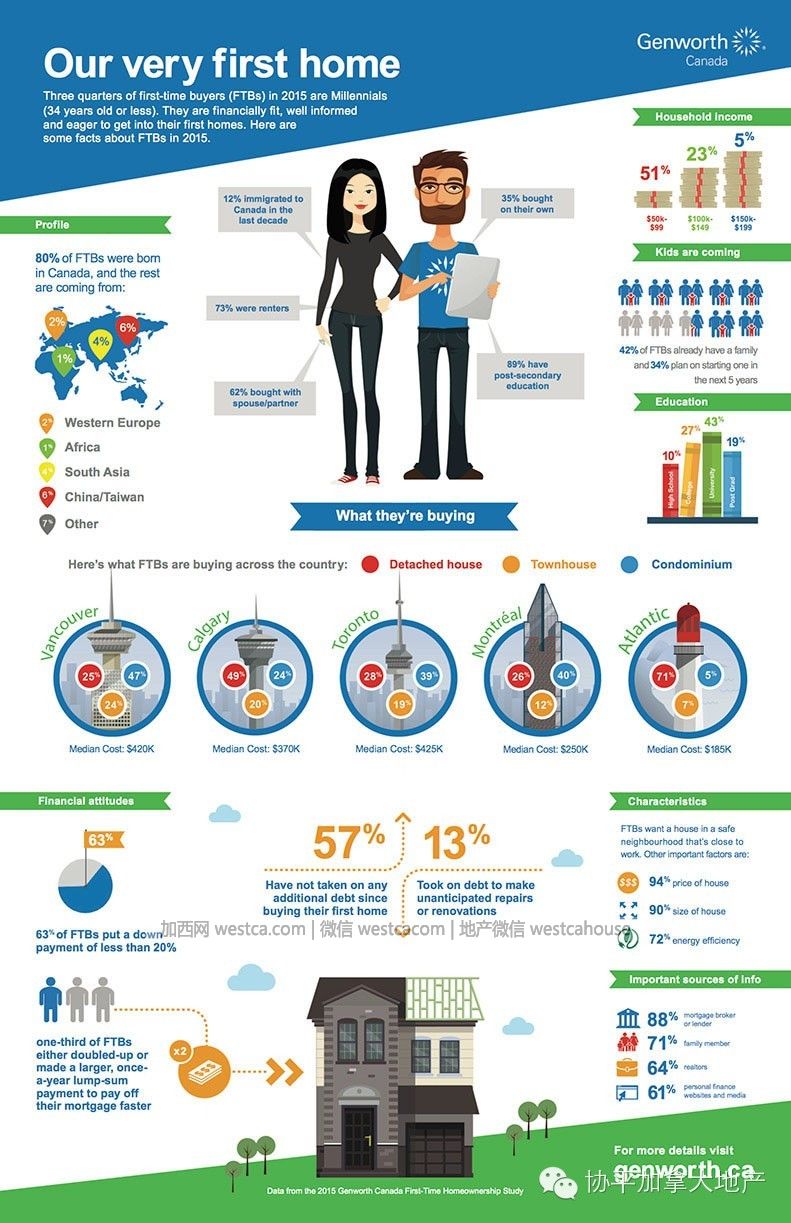 今年四月份加拿大贷款保险公司Genworth Canada最近针对首次购房者作了调查,结果显示,在温哥华和多伦多的首次购房者中,购置房产的中位数价格,分别为42万加元和42.5万加元。温哥华的首次购房者中,47%买的是公寓,24%买的是联排别墅。——在大城市,年轻人购买公寓已是大势所趋,可见未来公寓投资价值看好。