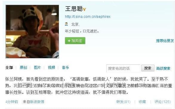 2011年,汪小菲和大S舉辦婚禮,隨後接受采訪時,汪小菲的母親張蘭稱舉辦婚禮的飯店是由王思聰的父親王健林免費贊助的,這下可惹怒了王思聰,他立即跳出來斥張蘭造謠,稱張蘭從未與自己的父親見過面,更談不上“關系好”,隨後更張蘭及汪小菲“裝×”。
