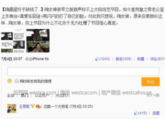 2014年7月,陶晶瑩被網友吐槽出爾反爾,參加真人秀節目,並調侃道陶女神素顏丑得不忍直視,王思聰也忍不住湊熱鬧評論陶晶瑩是“煞筆”。