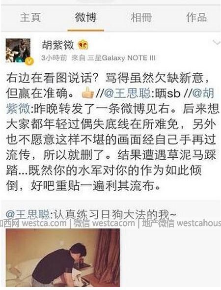 3月29日,王思聰在微博中發布照片,配文稱“認真練習日狗大法的我”。照片中,王思聰將愛犬正面騎在床上。微博發出後,瞬間引發網友爭議,原北京台美女主播胡紫微也轉發並評論道:“有多少人會因為這條微博對此人壹秒鍾由認同變厭惡?王家少爺確實能幹。”沒想到卻遭遇王思聰的“叁字經”問候,隨後兩人更言辭激烈的隔空互罵,問候家長爆粗口皆有之!