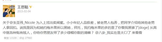 2015年2月4日,王思聰轉發網友“PanYR_”的微博,炮轟拾八線女演員朱聖祎為入上戲出賣多年閨蜜,更稱其不僅被老男人包養,更把同學介紹給其他老男人拿回扣,導致朱聖祎將他告上法庭。- 新聞來源於其它媒體,內容不代表本站立場!
