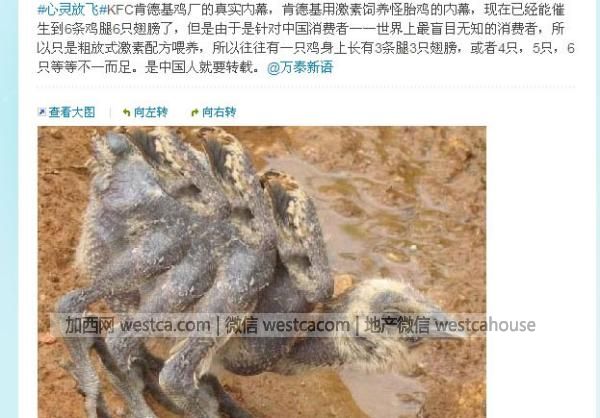 “我的壹個朋友的父親是某銀行的壹個高層領導,他和美國的肯德基之間有些合作的關系,壹次高層領導之間的互訪使我朋友的父親有幸參觀了肯德基的雞廠……每只雞有6個翅膀8條腿,身上全被插滿管子……”熟悉不?從BBS,到微博,再到微信,這個長盛不衰的故事壹直在廣泛流傳,每次出現都賺取10萬+的閱讀量。可以說,網上至今傳播著肯德基多腿雞的視頻和照片,據稱這是商家為了降低成本而用激素等手段催生出的怪雞。各種版本繪聲繪色的描述加上逼真的圖片和視頻。將對洋快餐心存芥蒂的人,推向更深壹層的質疑與責難,開始紛紛痛斥這種奸商行為。
