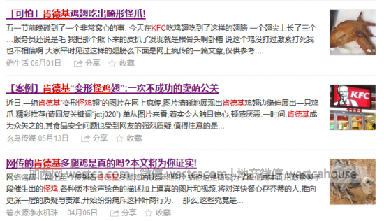 肯德基總裁屈翠容女士告訴媒體,最近這次爆發始於今年上半年,將壹起過往發生的消費者投訴與怪雞謠言捆綁在壹起,再配以聳動的標題和帶有明顯PS痕跡的圖片,通過微信公眾號,在朋友圈被大量轉發傳播。截至4月底,我們發現微信公眾號上有4000多條相關內容,其中超過130個賬號的帖子閱讀數超過10萬。這不僅嚴重誤導了消費者,也給品牌造成了傷害。