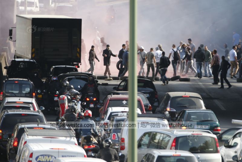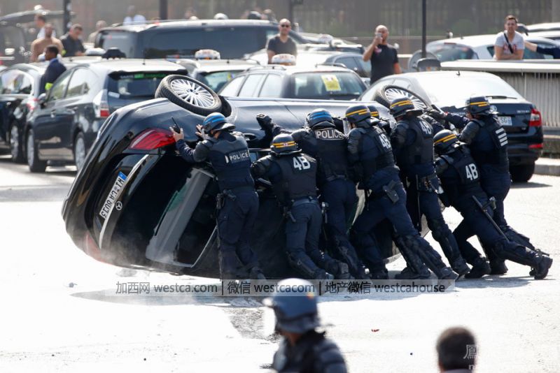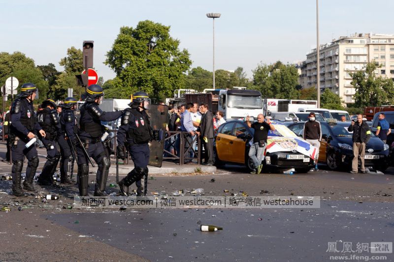 当地时间6月25日, 法国巴黎,出租车司机封锁前往机场和火车站的道路,抗议美国Uber打车应用。出租车司机表示,Uber已经威胁到了他们的生计。