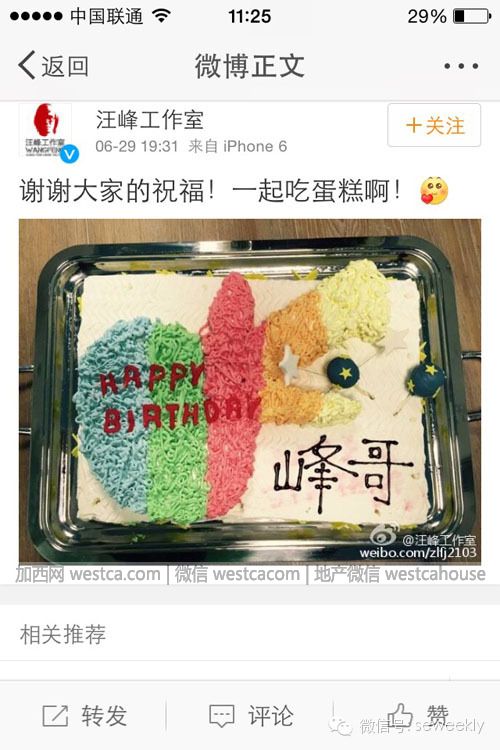 文章求婚的新聞壹出,網友們紛紛萌生同壹個念頭:汪峰今天又搞什麼幺蛾子被壓下頭條了?sad!今天原來是汪峰的44歲生日。汪峰工作室還專門買了蛋糕為峰哥祝壽!汪峰的半壁江山啊