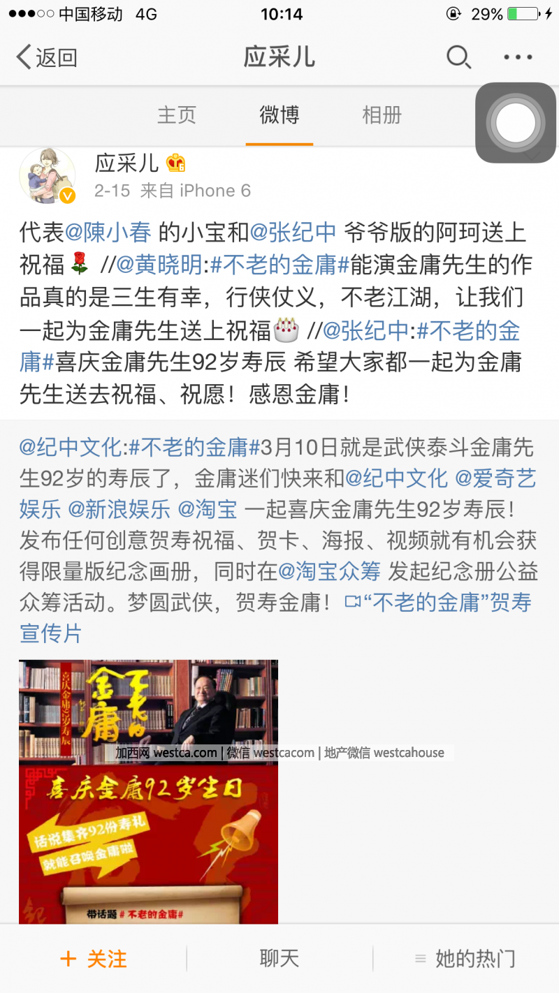 微博上,曾出演过金庸武侠剧的“韦爵爷”黄晓明、“小龙女”刘亦菲、“阿朱”刘涛、“赵敏”安以轩、“阿珂”应采儿等明星艺人,也纷纷加入祝寿大军,送出祝福。