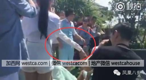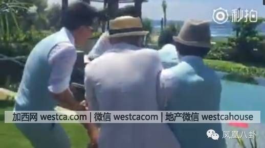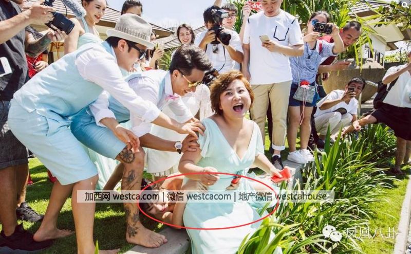 穿白西装的新郎示意丢到低处的水池中…还不忘安慰不断挣扎的柳岩说“水很浅的”。