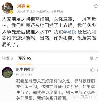 媒体人刘春也是在场嘉宾之一,事后在柳岩等人都没有发声的情况下,发微博称就是朋友之间相互闹闹,关你屁事,讽刺网友圣母。文中还补充韩庚还被扒上衣了,自己也被推下水池了…但这些似乎都不是大家可以这样对待柳岩的合理解释,无关粉丝不粉丝,是对女性的基本尊重。