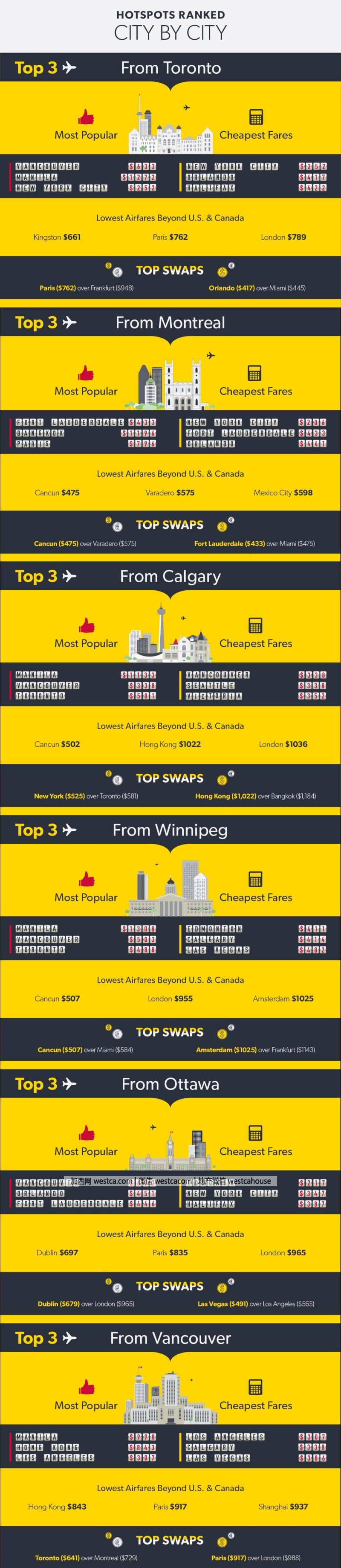 又到了夏季旅游出行的时间,众所周知,加拿大国内飞那儿都不便宜,要论起加拿大人旅游出行机票最便宜的城市,加拿大没有一个城市进入前10名,所以旅游出行,想实惠就要把旅游计划放远些,再远些,国外啦!